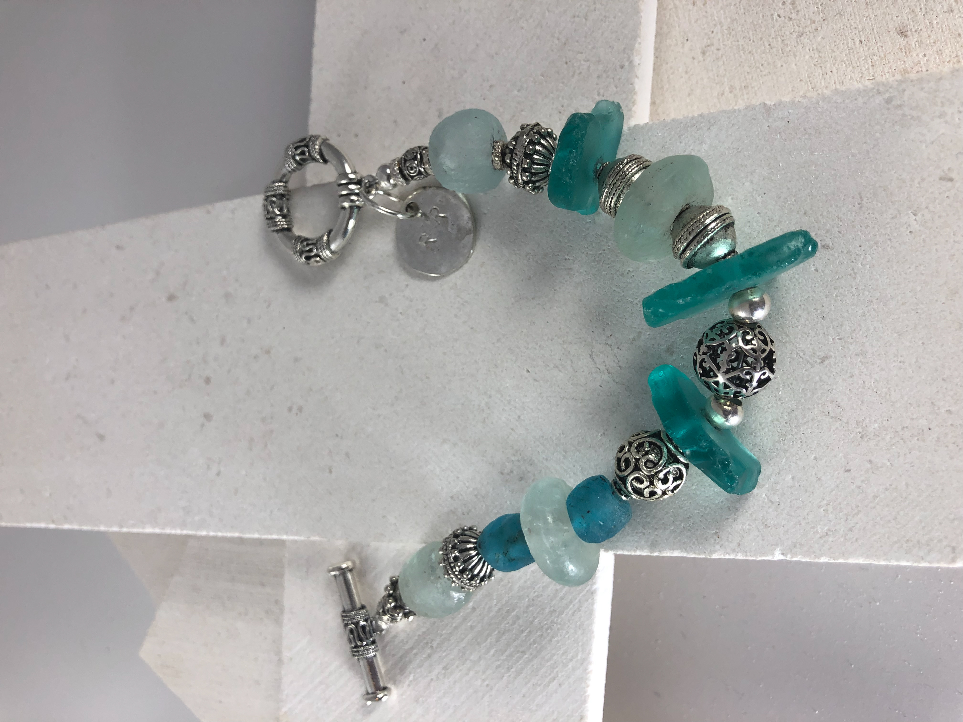 Turquoise sea glass bracelet 9" in length. 4 sea foam glass beads. 2 Turquoise glass beads. 7 ornate silver beads. Ornate silver toggle.